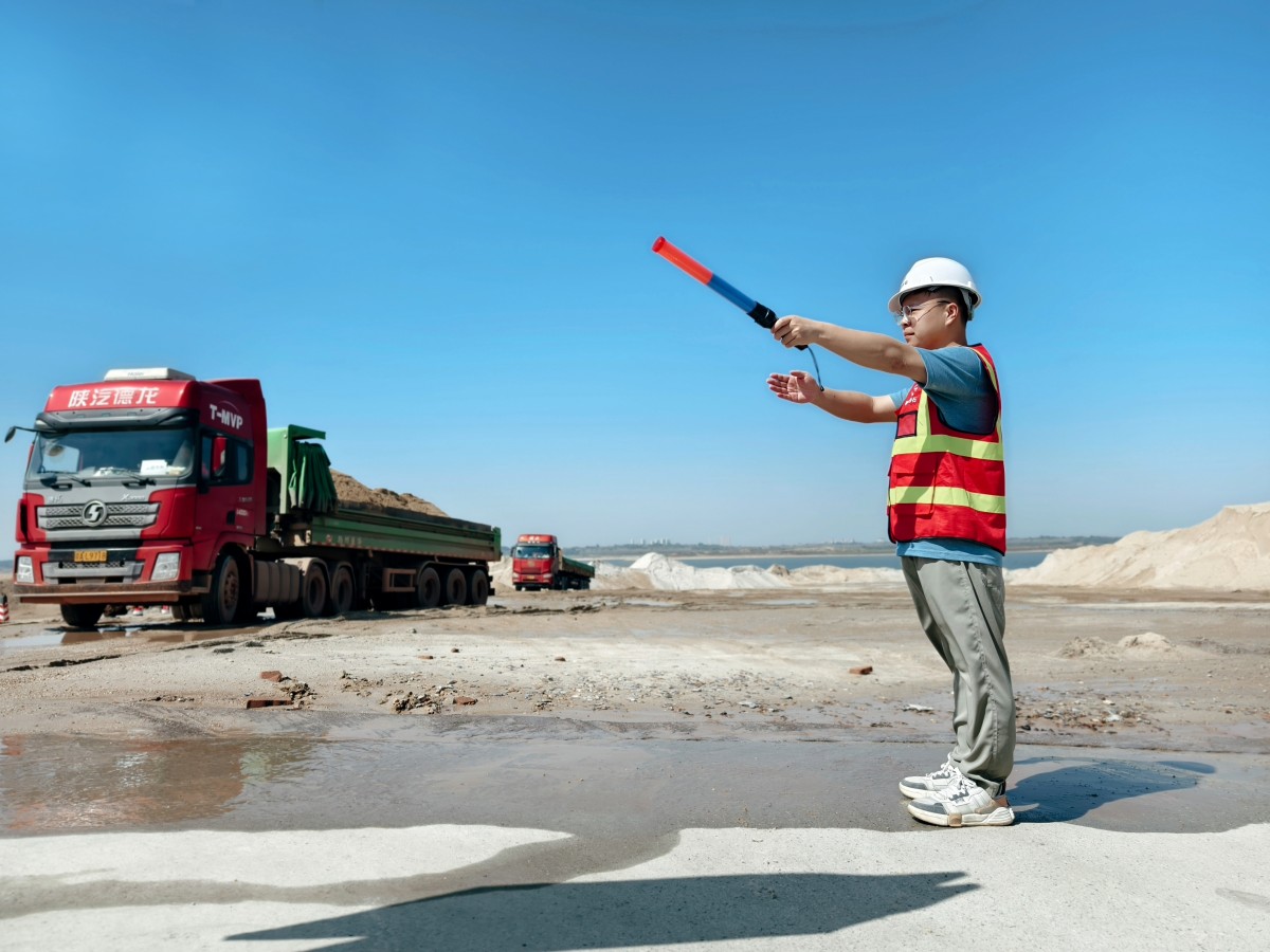 9點(diǎn),為了保障運(yùn)砂車輛快速有序地進(jìn)出砂場(chǎng),90后的兩位小伙兒熊峰和徐成瓏身穿反光背心,手持指揮棒分別在砂場(chǎng)出入口和發(fā)貨場(chǎng)地上,扯著大嗓門指揮引導(dǎo)著車輛排隊(duì)有序出場(chǎng),維護(hù)砂場(chǎng)經(jīng)營(yíng)秩序。待回到磅房后,他們只是輕輕拍了拍身上的塵土,喝口水,絲毫沒(méi)有抱怨。