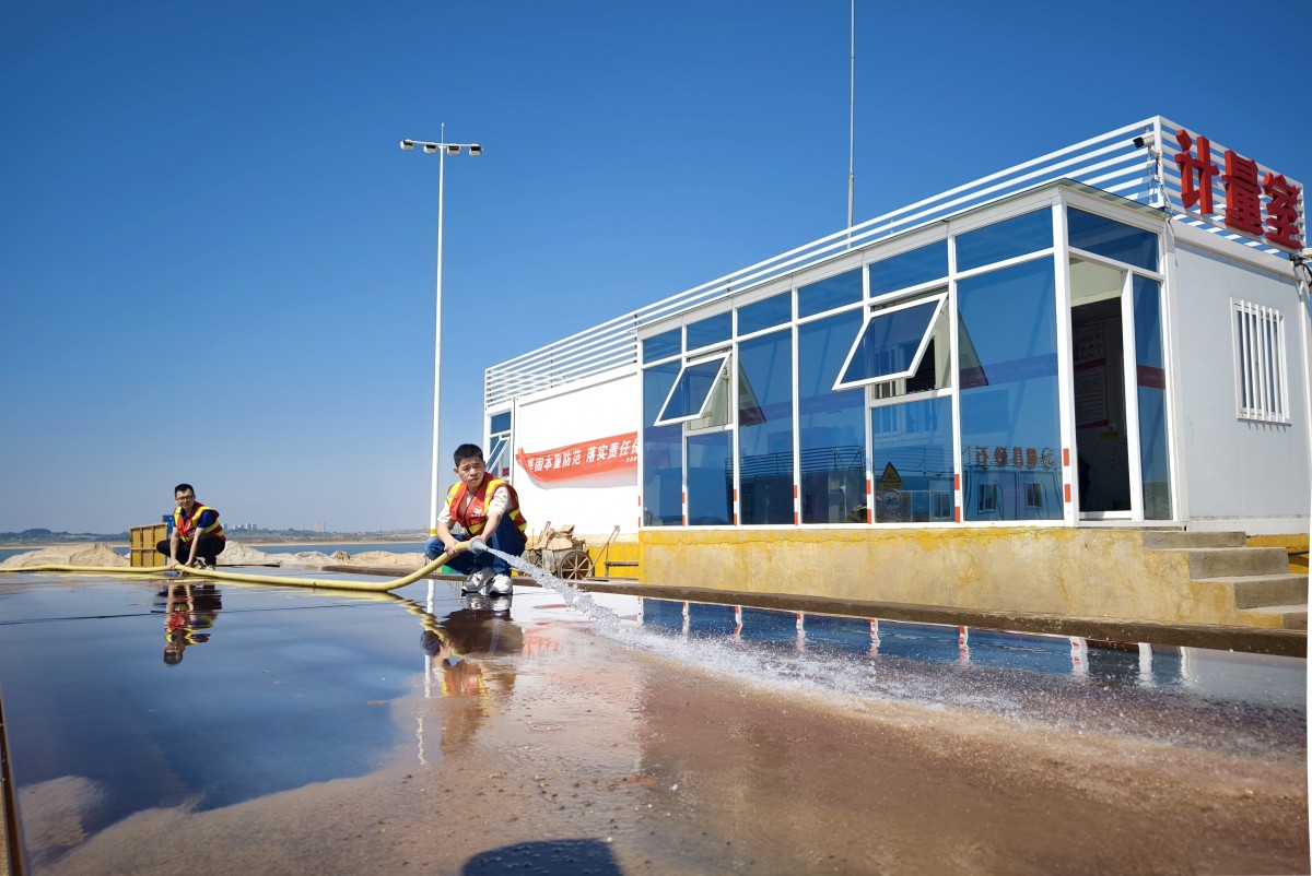 10點(diǎn),在地磅上,萬(wàn)騰達(dá)和郭陶源正在手持高壓水槍,一遍又一遍地沖洗著地磅上的余砂。原來(lái),上午運(yùn)砂車輛排起了長(zhǎng)龍,一輛接著一輛過(guò)磅,每輛過(guò)磅的車都會(huì)帶著部分泥沙、積水,地磅積累太多砂石,如不及時(shí)清理,貨車過(guò)磅時(shí)數(shù)據(jù)差異也將增大,為保證數(shù)據(jù)的準(zhǔn)確性,當(dāng)無(wú)車輛上磅時(shí),他們就會(huì)迅速拿起鐵鍬或高壓水槍清理地磅上的沙子和泥。
