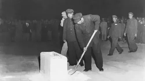 1949年9月30日,中國人民政治協(xié)商會議第一屆全體會議舉行最后一次會議。為了追念一百多年來為新中國的誕生而英勇獻身的人民英雄,這次會議一致通過了修建人民英雄紀念碑的決定。當天會議閉幕后,毛澤東等領導同志和參加會議的代表們來到天安門廣場,為人民英雄紀念碑舉行隆重的奠基典禮。在宣讀完畢親自撰寫的碑文后,毛澤東率先鏟土覆蓋在碑基之上,為紀念碑奠定基石。