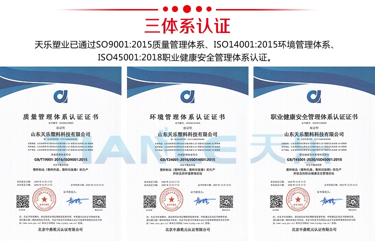 天樂塑業(yè)公司通過ISO質(zhì)量管理體系、環(huán)境管理體系、職業(yè)健康安全管理體系認證,AAA企業(yè)信用等級認證。